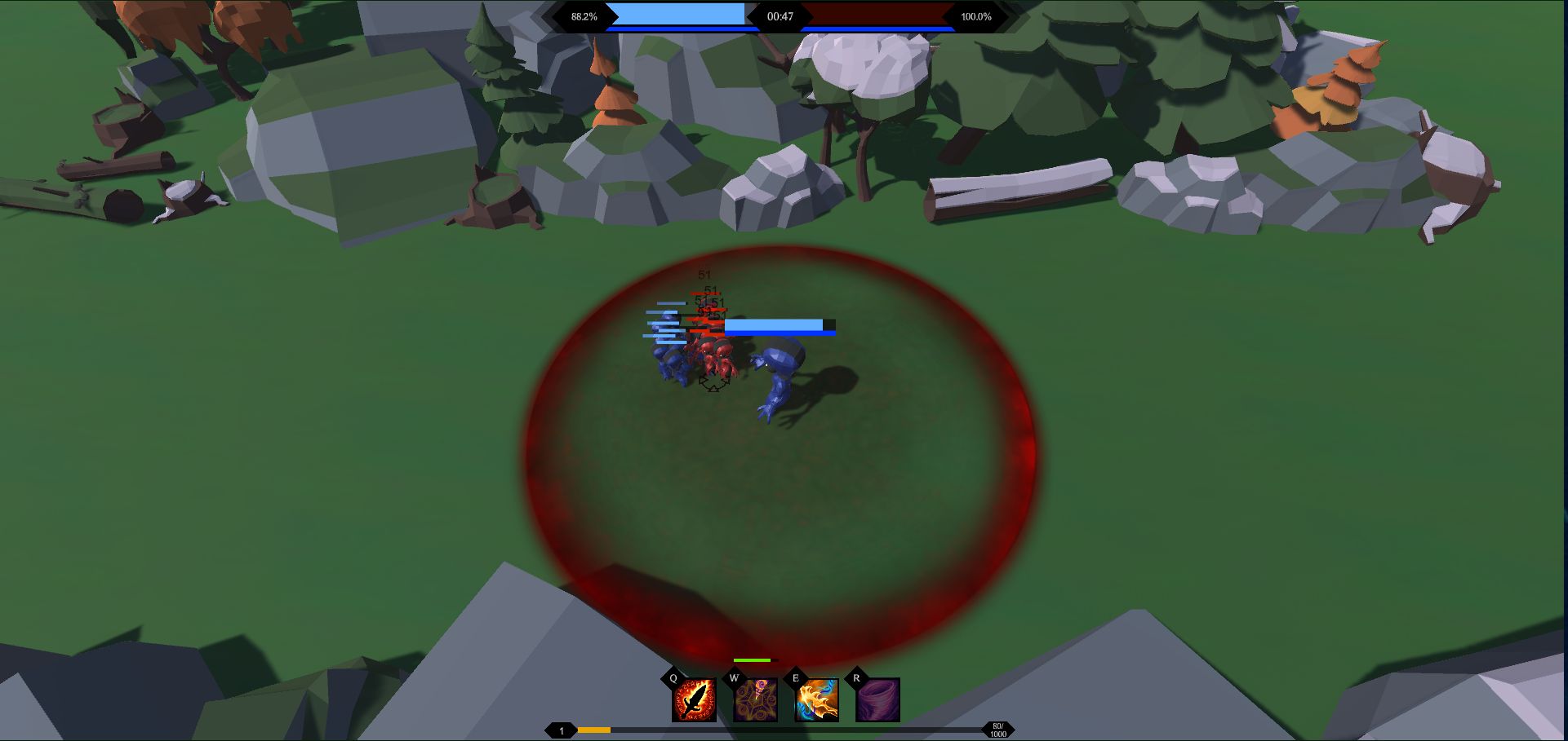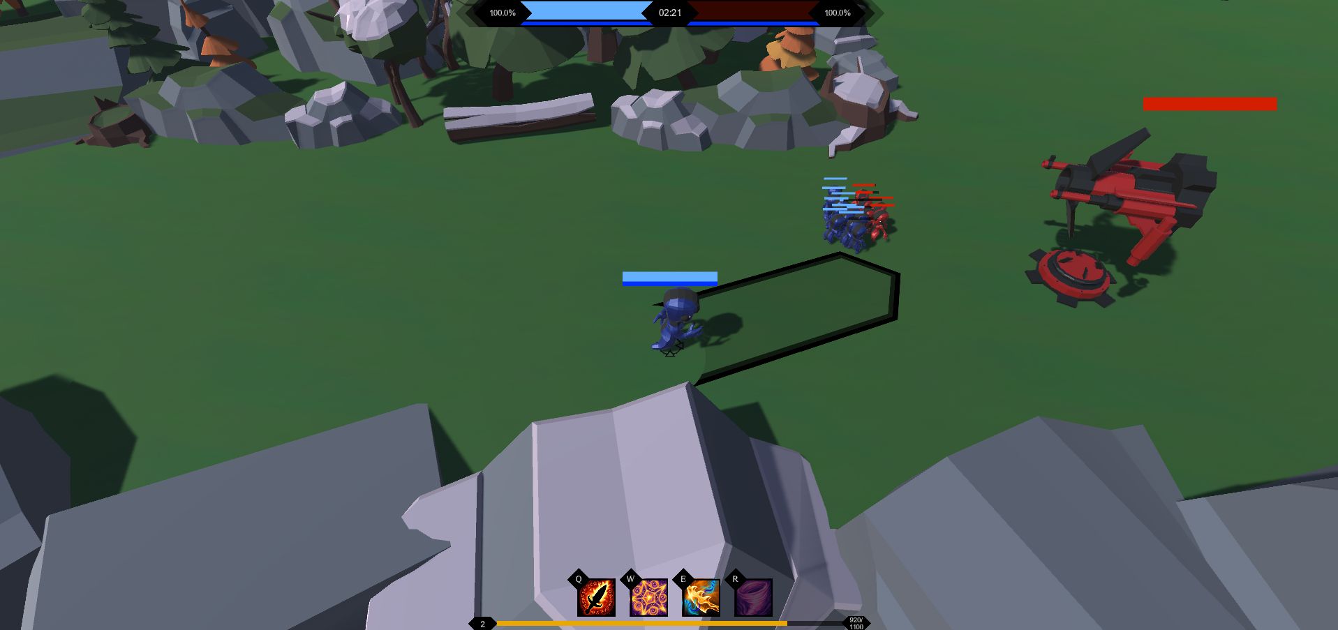 A single lane MOBA with two turrets on each team, periodically spawning creeps, and one champion with four spells. Spells unlock and become stronger when the champion collects XP and levels up. The result of a two-man university project as a final requirement to complete a game development course.